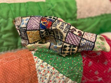 There’s nothing quite as cozy as a handmade quilt. This piece captures the variety of fabrics, textures, and fabrics that are found in your granny’s quilts, but with a sparkly B&B flare.